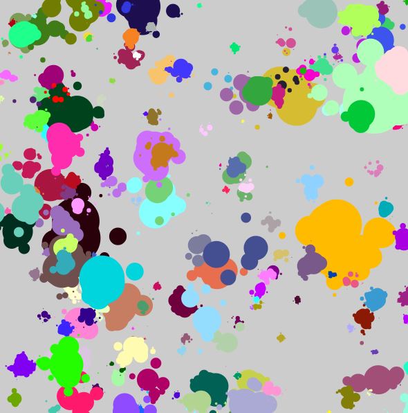 A simulation. Blue dots reproduce, red dots kill.